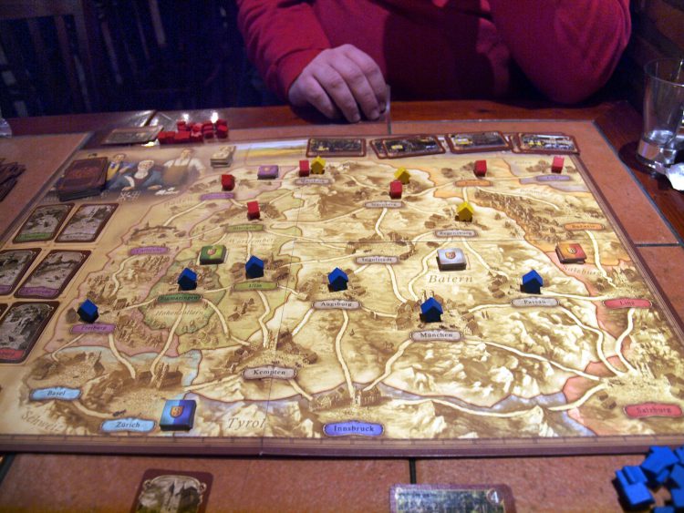 Thurn und Taxis is the 2006 Spiel des Jahres winner designed by the wife and husband team of Karen and Andreas Seyfarth. Mr. Seyfarth was a previous solo SdJ winner for Manhattan, though his most widely-known design is Puerto Rico – a watershed in action selection games that has also been criticized for its eliding of colonialist history.Thurn and Taxis is named after the titular German private postal service operating for sixty years in the 19th Century. Theme and gameplay are simpatico; players race to quickly and efficiently connect a network of post offices on the map through card drafting, hand management, and set collection.