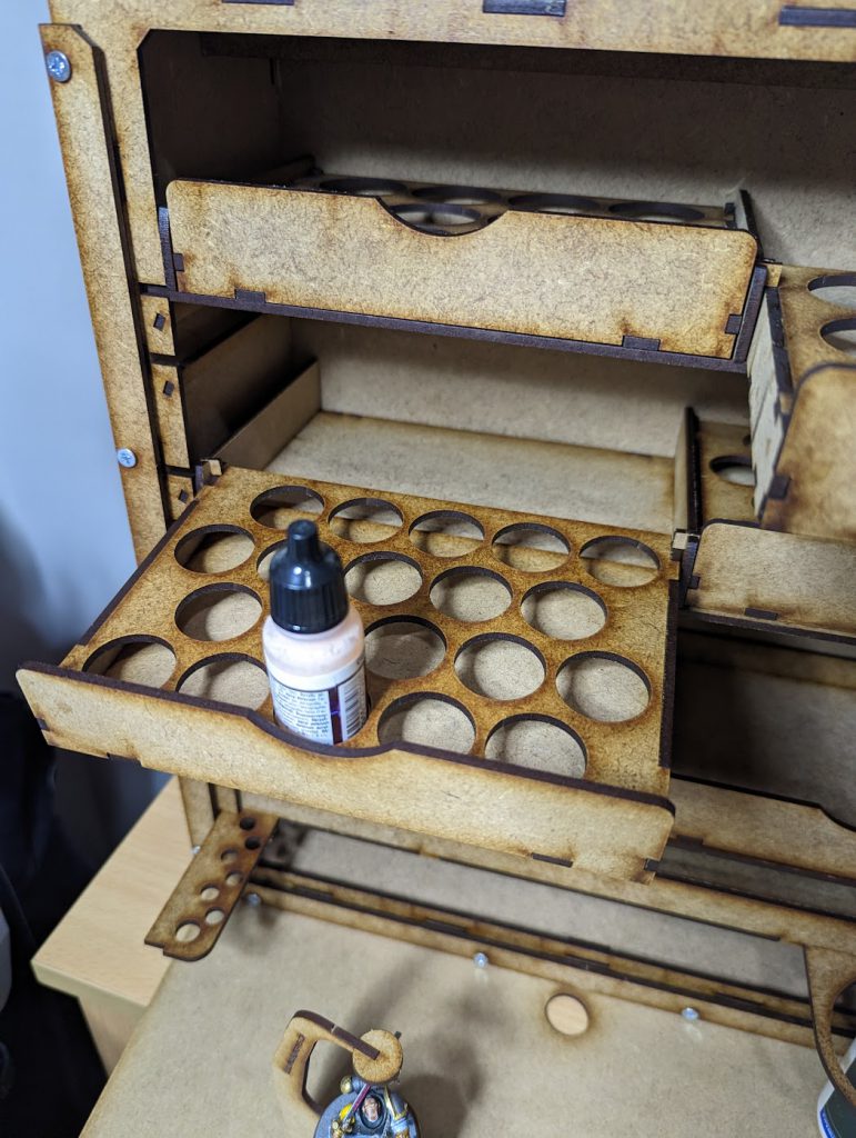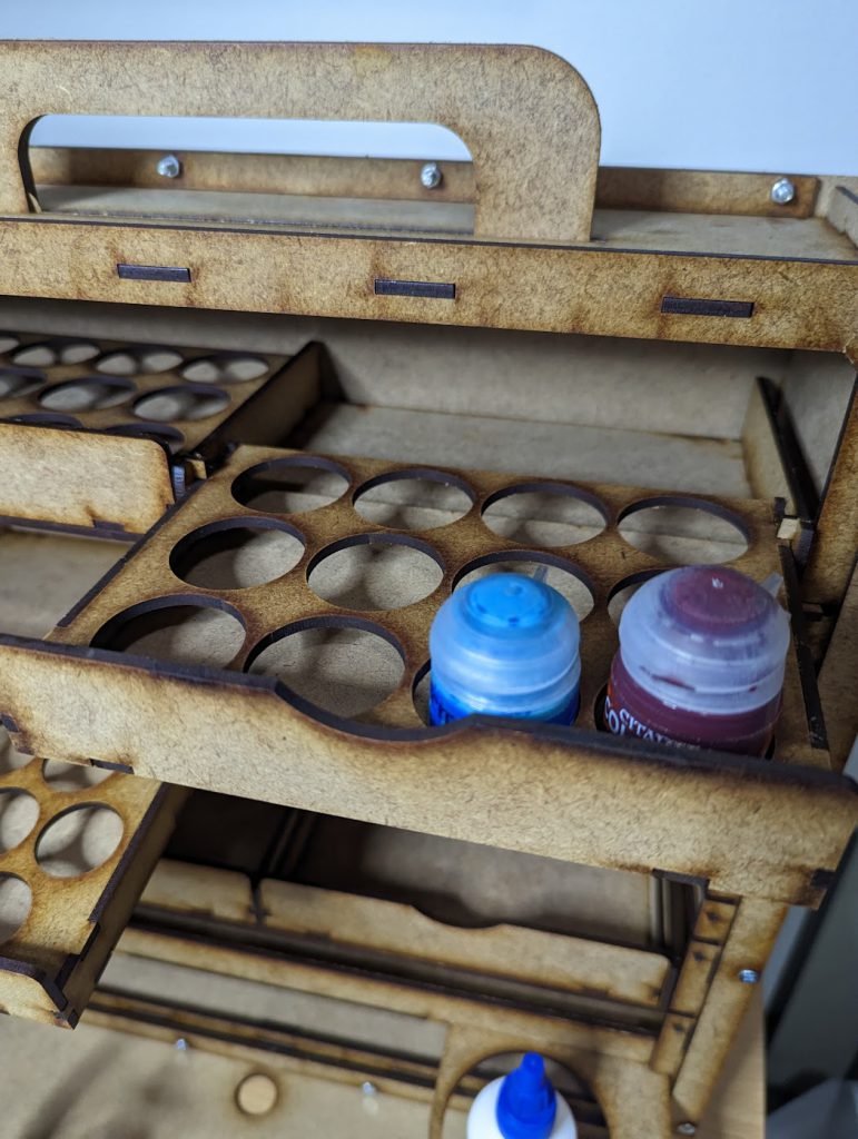 The Rochela is billed as a Portable Painting Studio which Bandua Wargames has designed for for those kitchen table hobbyists who may not have the room for a permanent work space and those who who like to travel with their hobby projects and want something more suitable than cramming everything into one of their many spare cardboard box lids from their latest impulse purchase… I identify more closely to the latter than the former myself.Measuring in at 45x40x15cm (roughly 18x16x6 freedom units) the Rochela comes in three different versions. Which one suits you best? This pretty much boils down to what paints do you use the most. The Rochela P26 has space for 80 26mm-diameter dropper bottles (Vallejo, Army Painter, Scale75, AKA, etc); the Rochela P36 has space for 48 34mm-diameter pots (Citadel paints, Tamiya, etc); and lastly the Rochela Mixed is oddly enough a mix of the other two with space for 64 paints (40x26mm/24x34mm). I have the Rochela Mixed myself because as much as I love my Contrast paints, I also have room in my shrivelled ice cold heart for Scale75’s metallic range.