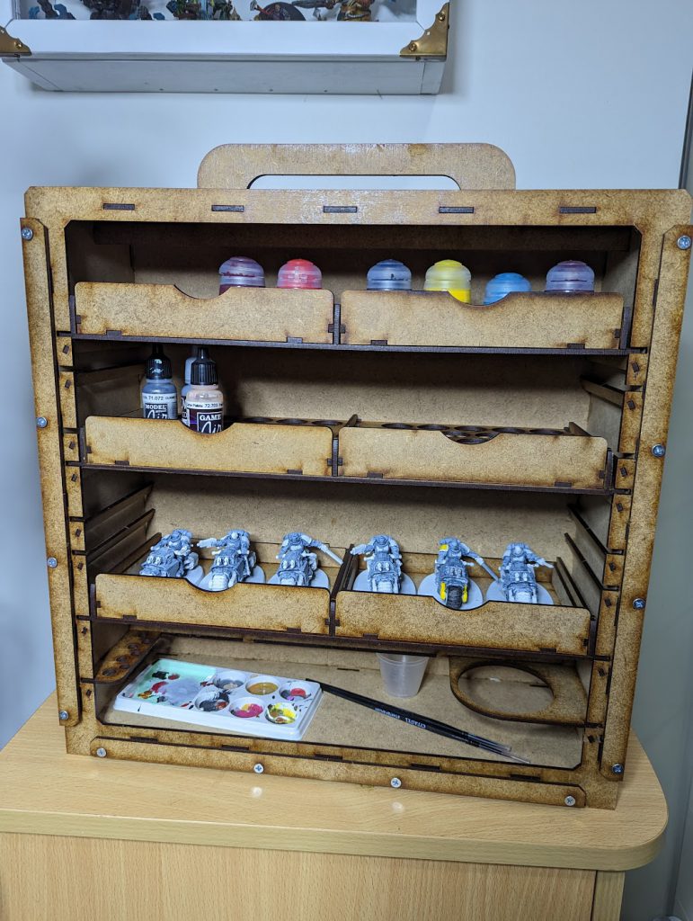 I’m quite pleased with how it turned out.There’s a couple of areas I’ll want to tidy up of course but I already have a few ideas on adding a few little bits and pieces to improve it over all for my own use. First thing I plan on doing would be wrapping the handle so it’s kinder to my soft delicate hands. I’ll also plan on glueing in some metal sheets so I can stick magnetised minis to trays etc. Maybe some velcro straps to tie down things at the bottom?Have any questions or feedback? Drop us a note in the comments below or email us at contact@goonhammer.com.