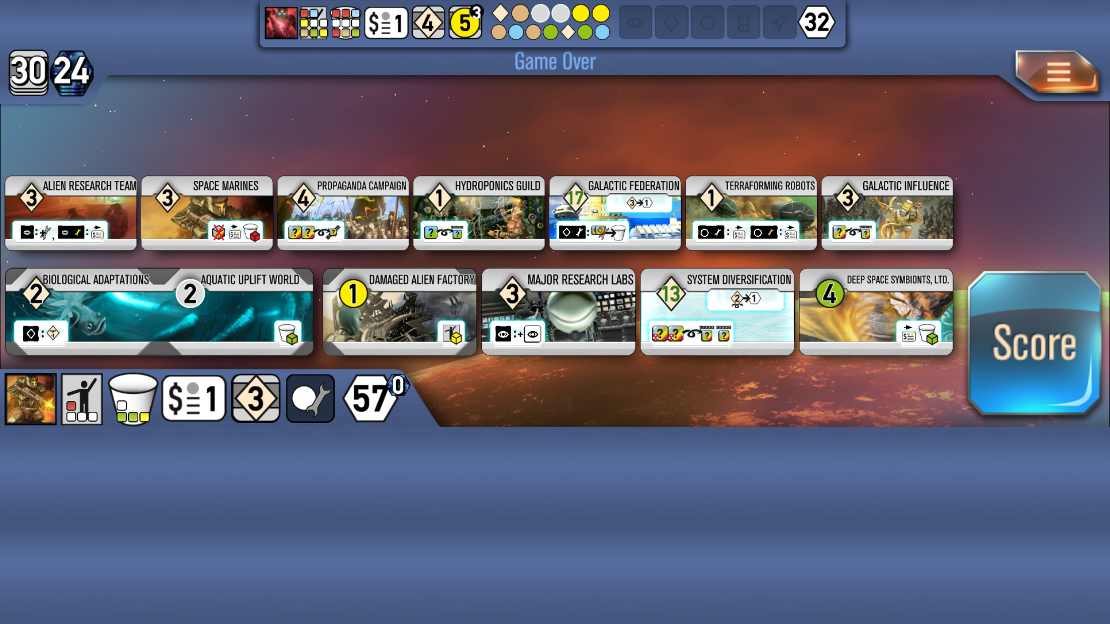 Roll and Race for the GalaxyBut how does the game stack up to it's older, card-based brother Race for the Galaxy? Well, my opinion is a bit mixed. Race is definitely more competitive, as there are few fewer random elements than in Roll. Race is also more streamlined and faster to play. For example, I once tried to play an entire game of Race for the Galaxy while holding my breathe. It didn't work at all, but that I thought it might shows how much faster Race is. The rules for Race are also much simpler, to the point where most cards don't even have text on them, just iconography to remind you how things work. If you are looking for a competitive card-based game that plays fantastically in an single-player app, then I'd pick Race for the Galaxy.