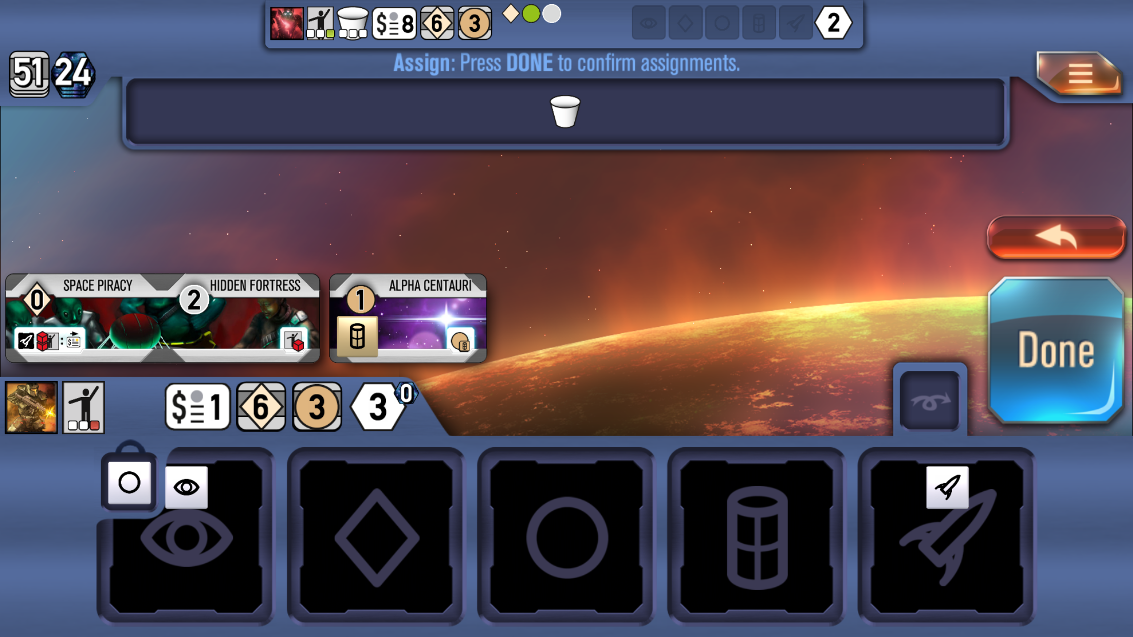 The Explore phase is selected with two dice allocated to it. I hope the AI selects the Ship phase, so my die allocated there can do some workAnother clever mechanic of this game is that you may pick any phase with any dice - the symbols don't have to match. If you are going for a world-settlement victory and happen to roll a useless Ship, then you can use that dice to select the Settle phase and treat it as if it had rolled a Settle symbol. This gives you some control over the randomness of the game without waiting for developments.
