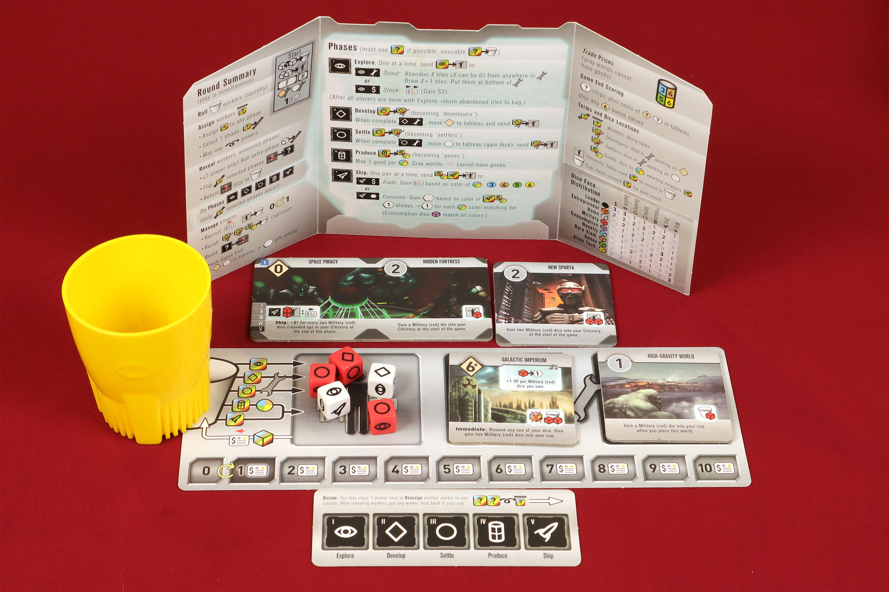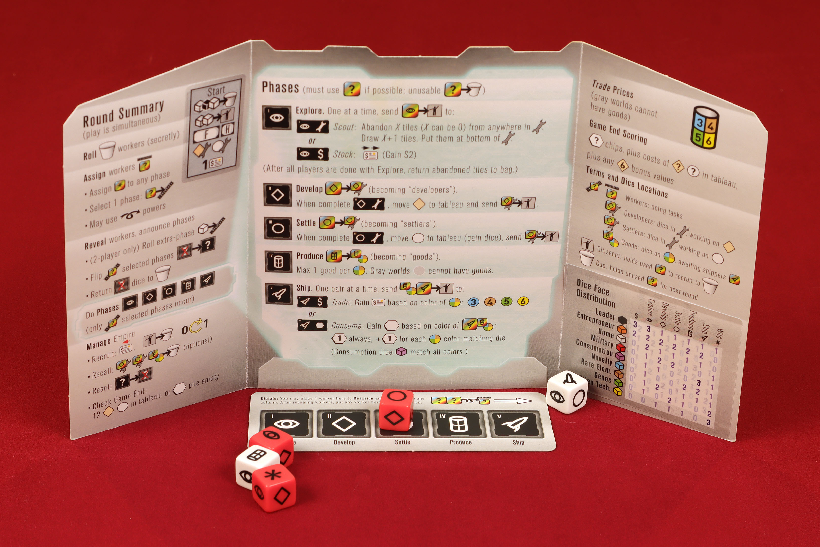 The game revolves around dice. Rolling them is even right in the title. But these aren't your parents dice with pips or numbers. No, these are dice with symbols that correspond with the different phases of the game: Explore, Settle, Develop, Produce, and Ship. At the start of each turn you roll all the dice in your cup, and whichever phase they land on is the phase in which they can be used. Roll three settlers and two developers? That means you have three dice that can be used to settle new worlds in your empire, and two to help develop new technologies.