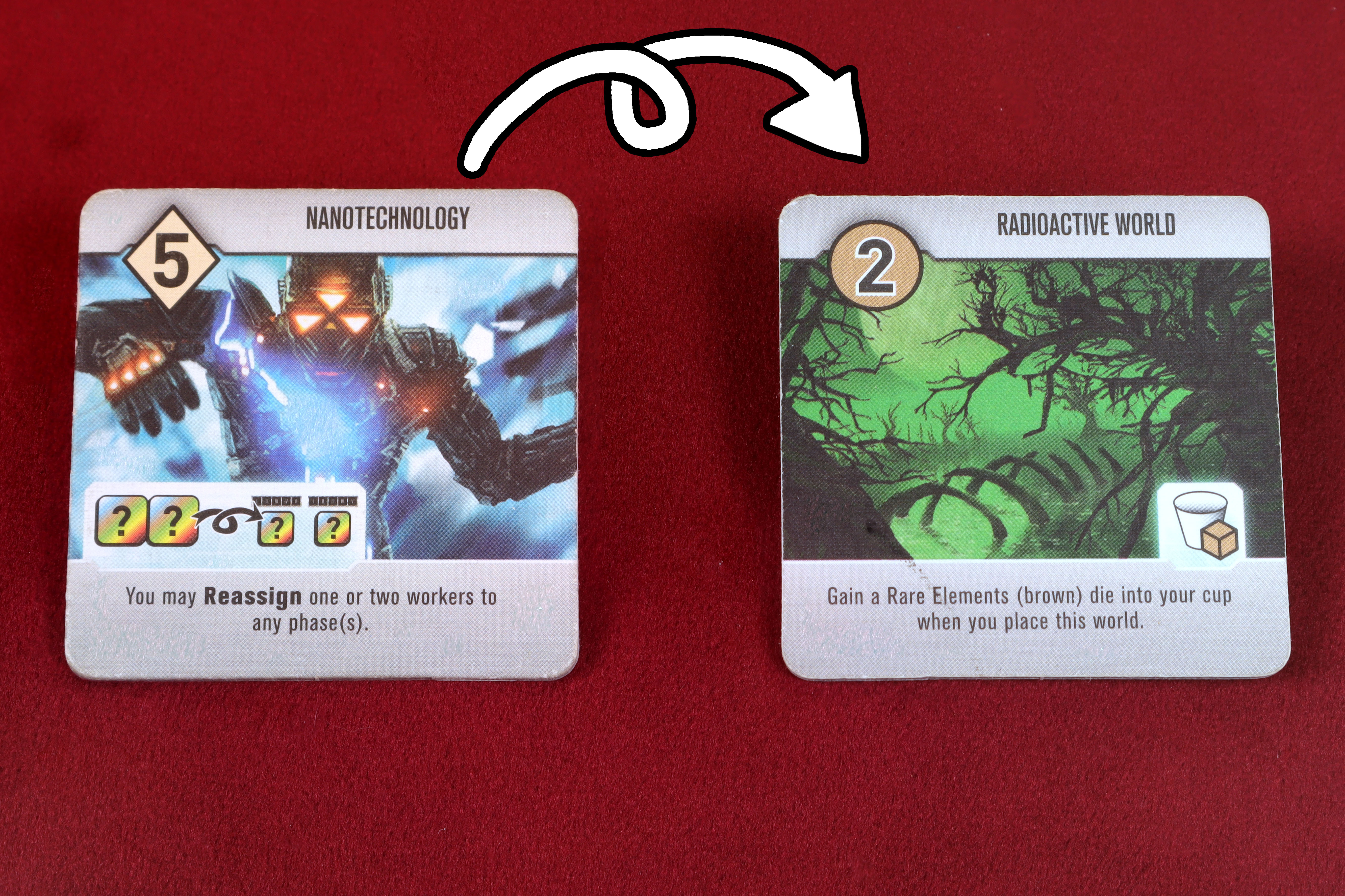 Two sides of the same tile, each with their own pros and consEach tile has a big number on either side, and that number represents two separate things: how many sweet, sweet victory points it's worth, and also how many resources it takes to develop or settle. If a world has a giant "3" on it, then that means it requires you to spend 3 dice showing the Settle phase to add it to your tableau, and once you do that it's worth 3 victory points at the end of the game. But thinking back on how the dice work, you might wonder what are the odds you'll get 3 Settles on your dice, when your Home dice only have a single face with the Settle symbol. That's where developments come into play. Developments grant powerful abilities that change the rules. One might let you treat a single dice that landed on Explore as if it instead was a wild. Another might let you pretend you rolled two bonus extra Ship's each turn. They might even let you draw extra tiles during the Explore phase, lower the cost of developments, or refund the cost of newly settled worlds.