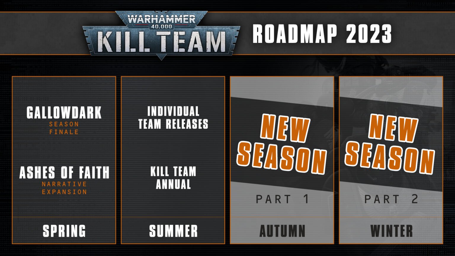 The Kill Team Road Map was published, and there are releases each quarter.Spring is the last Gallowdark box, Gallowfall, followed by Ashes of Faith (which we were told was coming very soon, before tenth edition). Then Summer gives us individual releases for everything they haven’t put out so far (Votann, Beastmen, Drukhari, Inquisitorial warband, etc.), and a Kill Team Annual with all the Gallowdark rules in one place. Space Marine Heroes Series Four will also come out during this period, depending on how it is distributed to markets.