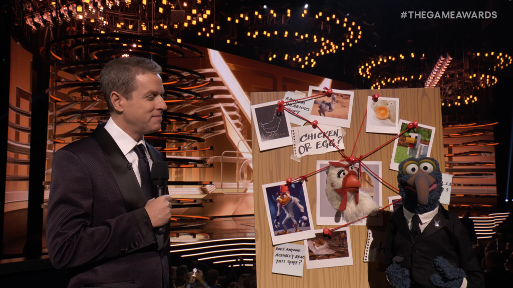 Swiftblade: Three separate weird celebrity appearances, truly we are blessed. First, we got Matthew McConaughey giving us the classic “I don’t have any idea why I’m here or what a video game is” schtick, and the saddest “alright alright alright” I’ve ever heard. Then, we got Anthony Mackie trying to channel a cult of personality rapport with the audience, a la Keaunu Reeves, and instead is just awkwardly pointing at a few people and shouting “Oh you know this guy knows”. It’s a train wreck and I could watch an hour of it. Lastly, Simu Liu shows up in a walking boot and tries to explain what its like to be over thirty years old to gamers. No notes. All three were terrible in their own special, sloppy way.Oh, and Gonzo is just super horny for chickens and you know what? Good for him.