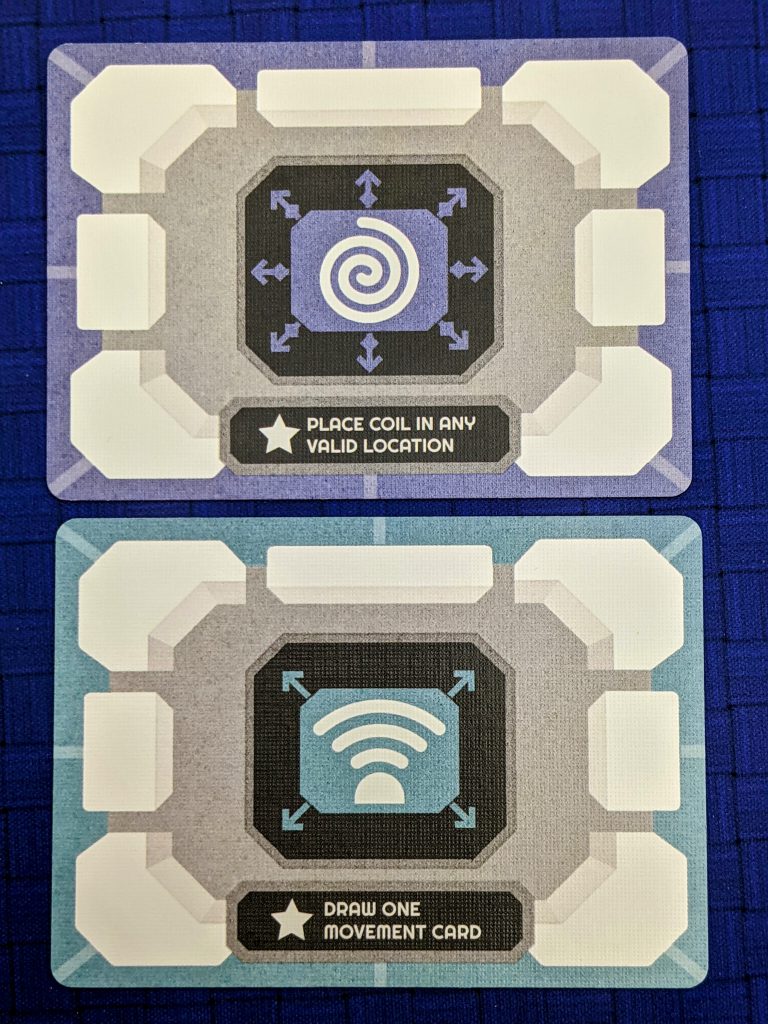 The other side of the mission cards are movement cards with two different movement point values at top and bottom. The top value (1,2, or 3 points) is the default moves you get when you play it. The bottom value (3, 4, or 5 points – always better) can only be used if, prior to playing a movement card, the six-card tableau of module cards matches the three-card pattern (and matching "anchor" card) depicted on the card you play.