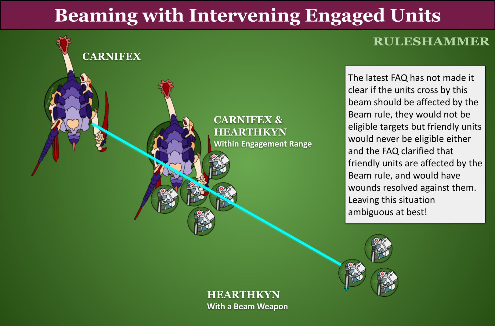 Friendly units are not "eligible" targets for shooting, so while a bit odd that these beams could apparently pass harmlessly through friends it wasn't really ambiguous. The rule only said to make wound rolls against units there were eligible targets for the weapon along that line, and that hasn't changed - the rule still says this, and now the FAQ answer contradicts it. This leads to a series of follow up questions and issues.Post-FAQ Suggestion: Do what it says; a friendly unit can be hit by beams, however keep on reading for some of the edge cases this FAQ causes!