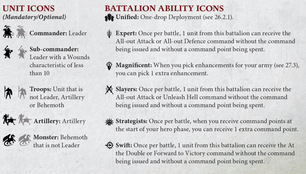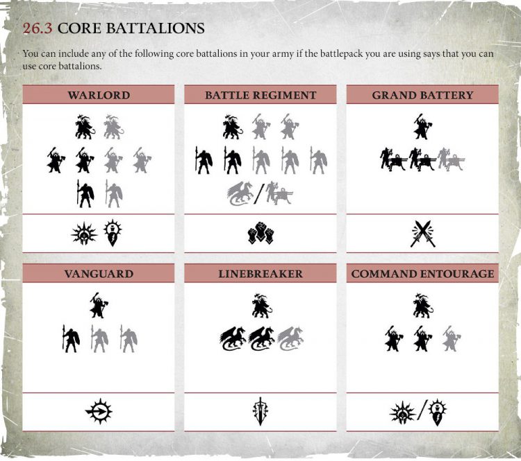 Dropping the big bomb first, Warscroll Battalions appear to be gone for Matched Play and can't be included. This harps back to what Ben Johnson mentioned in one of the preview videos about wanting to balance out the “Haves and Have Nots” when it came to these. While it technically doesn't write them out entirely, it does say that this is going to be contingent on the "Battlepack" you're using. Battlepacks are supplements that will come with the General's Handbook or expansion books for Path to Glory. The Battlepack that is inside the core rulebook specifically does not allow Warscroll battalions but does allow Core Battalions. Core Battalions are a new mechanic for the game: Much broader requirements, requiring certain types of units instead of specific ones and grant a small bonus when taken. Whether these cost points or not isn't clear, we need to wait for the General's Handbook but for now they appear to be free. The Core Rules state that you're allowed to use them as long as the battlepack you're using allows them – in turn this allows events to pick and choose what they want to be included, or allows Games Workshop to add new Core Battalions in each years General's Handbook, potentially allowing them to shift the game slightly. Want a more Monster themed event then specifically state that you must take a Linebreaker Battalion, don't want loads of Artillery then ban the Grand Battery Battalion. Simple right?