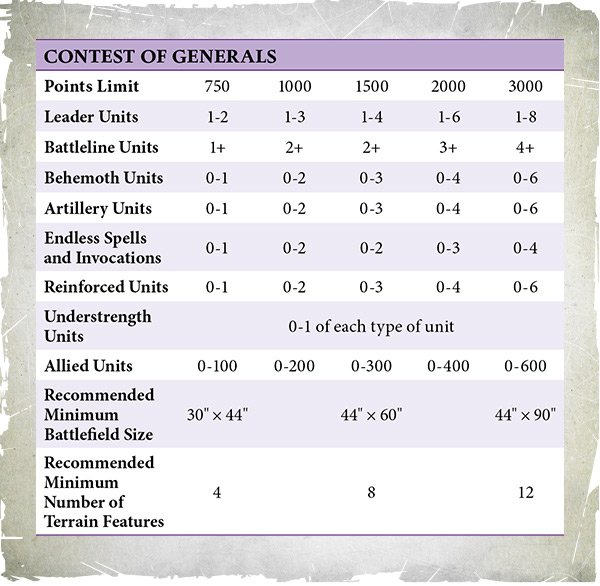 So, army construction for Matched Play has changed a little bit. Below is the (newly renamed) Contest of Generals table. This type of table will seem familiar to those who played the previous edition of the game but has a fair few new rows you need to pay attention to.