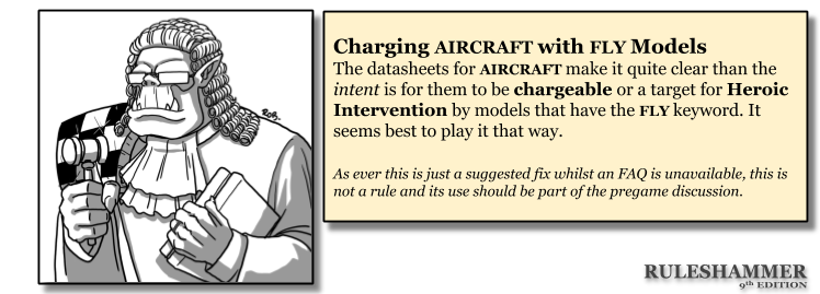 Wings: We obviously do not think this is the intent or endorse playing like this – this will be swiftly fixed, as it’s clear from other rules that FLY units are still supposed to be able to melee AIRCRAFT. Either there’s a missing “in the movement phase” here or “any kind of move” is meant to be a shorthand for “Normal Move, Advance or Fall Back”.As such here is another Ruleshammer suggested fix for this issue.