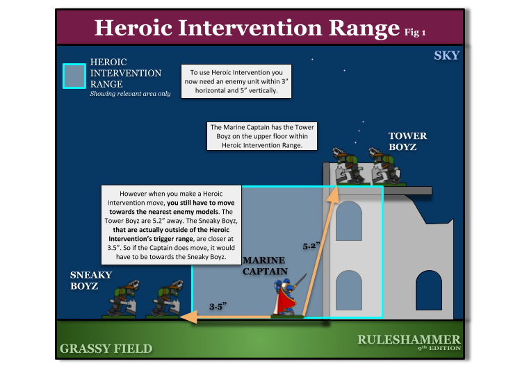 Similar to coherency and engagement, Heroic Interventions get a 5” vertical distance added to their trigger range, so that you can heroic if an enemy tries to hide on the second floor. Because you still have to end the move closer to the nearest model, this can cause some slightly odd effects - an enemy 2.9” to your left and 4.9” up is going to be further away than a model 3.5” to your right on the same level, so the presence of the first once can allow you to heroic into engagement of the second.
