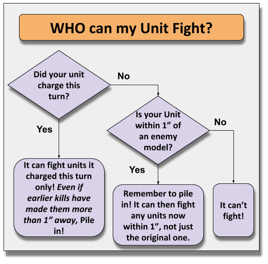 I’ve stressed this across several articles now, but these abilities do NOT allow a unit to ignore the rules for what they can fight. The flowchart still rules supreme (twice in one article)!They do get to Pile in and Consolidate again though, which can lead to another atypical situation.Q: If a unit that can fight twice in the Fight phase charges one enemy unit and destroys it during their first ‘fight’ in the subsequent Fight phase, and then consolidates into a second enemy unit, can they then attack that unit during their second ‘fight’? A: The charging unit can only make attacks against the second unit if it also declared a charge against it in its charge phase. [Core Rules FAQ Pg13]
