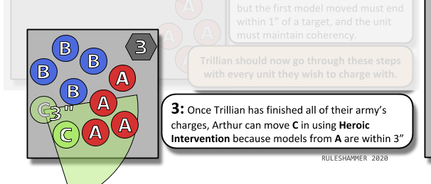 With the 6” Heroic Intervention plus the FLY keyword it’s possible to leap through both your unit, and the enemy and end up on the other side of them whilst in fighting range of another unit. It's important to note that Model C still is nearer to the closest model in Unit A than it started, as required by the Heroic intervention rule. It just started far further away than is typical, giving it quite a lot of freedom.