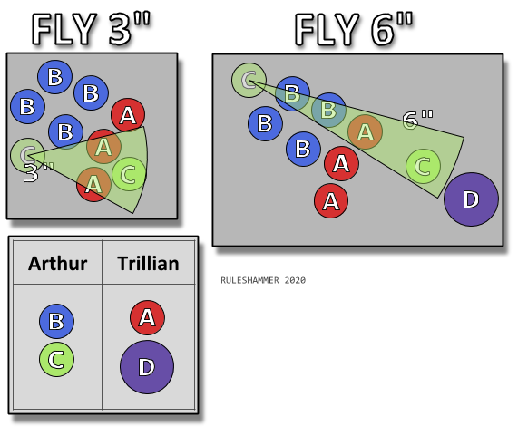 Heroic Intervention happens in the Charge Phase, not the Fight Phase. As such these models can make use of the FLY keyword to ignore enemy models. Practically with a normal 3” Heroic Intervention this isn’t especially useful, a very specific set of criteria would need to be met for you to be able to use it. I’ve shown them in the diagrams below. It does get a bit easier though if the Character has a longer Heroic Intervention that normal, 6” is the most common extension. See the diagram below for how powerful this can be, same belligerents as before!
