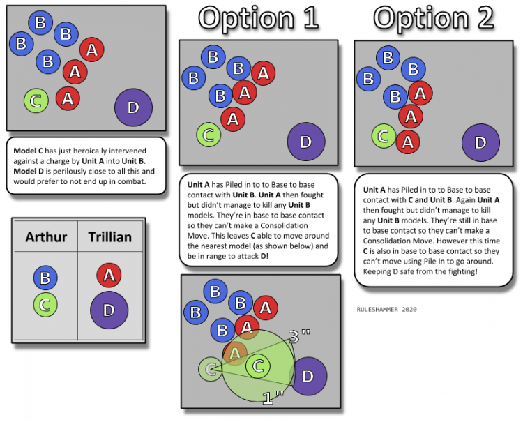 It’s important to remember that when activated models that Heroically Intervened are going to be able to Pile In. Often you might want to limit that. See the Diagram below for how this can vastly change what that Character is able to fight. To make things clearer I’ve included a small table of which models are on which side.