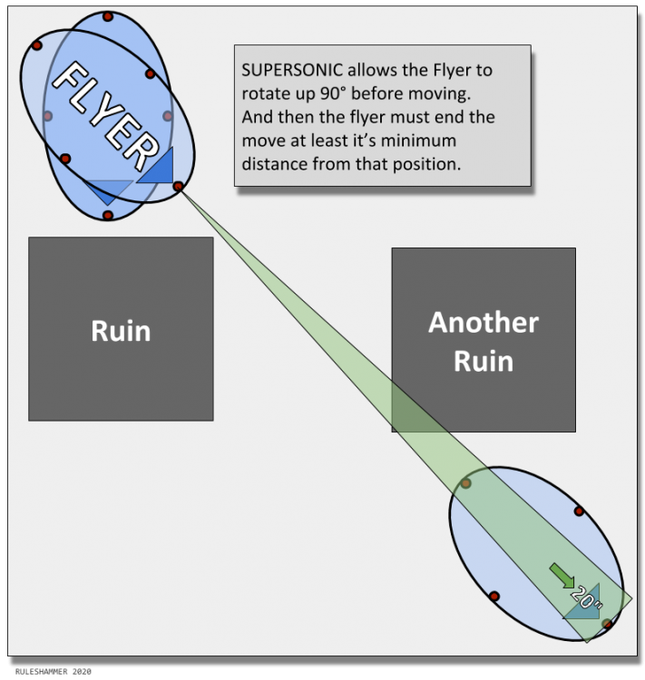 Supersonic: Each time this model moves, first pivot it on the spot up to 90° (this does not contribute to how far the model moves), and then move the model straight forwards. Note that it cannot pivot again after the initial pivot. When this model Advances, increase its Move characteristic by 20" until the end of the phase – do not roll a dice.