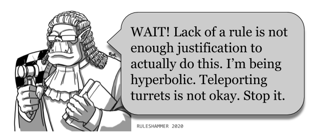 In this week’s edition of thinking way too hard about the rules, the gang discover that turrets don’t even exist and have been a shared hallucination all along.- James “One_Wing” Grover
