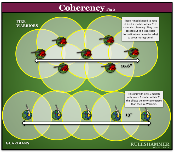 This rule isn’t without it’s quirks; for instance a unit of 5 models can actually cover a wider area than a unit of 7.