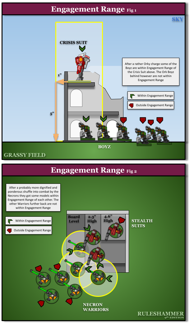 Engagement Range codifies the concept of "within 1" of the enemy" into a single term for reuse across the rules, and also adds a new feature - in 9th edition it now has a vertical component (5") allowing for fights across different elevations in ruins, over crates or around barrels. No longer is a model on a 1.1” tall plinth immune to combat… ANKLES are back on the menu!