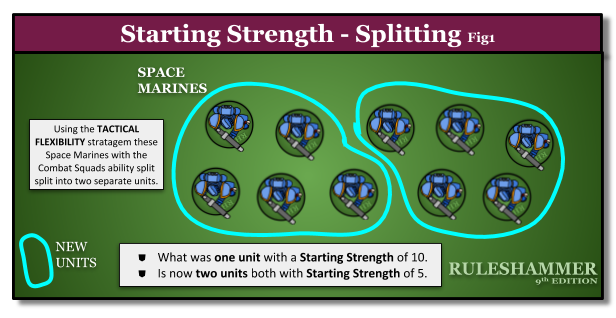 If a rule is used to split a unit into multiple units during the battle, the Starting Strength of each individual unit is changed to be equal to the number of models in that unit.