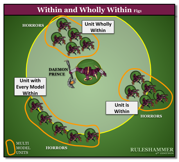 These terms have been cleared up a lot. "Entirely Within," the most confusing term of the old group, has gone and been replaced with rules that will now say they affect units if “every model in that unit is within." (Editor's Note: This brings the rules in line with Age of Sigmar, which only used the "within" and "wholly within" distinctions).
