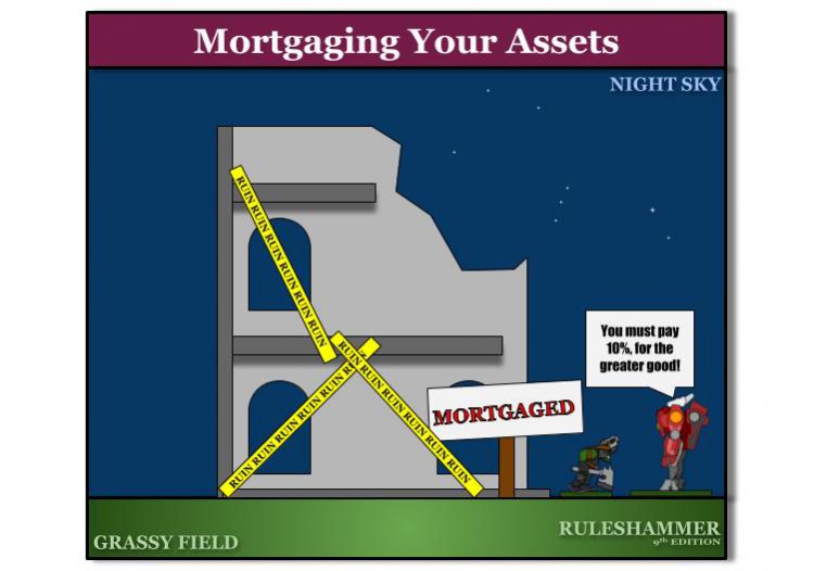that you have to pay the 10% back when trading a mortgaged property AND if you don’t unmortgage it right away you have to pay it again later on. This makes buying mortgaged properties significantly more expensive. GREGNOTE: This rule is horrendous. You think I don't got enough problems in life, that I need to be doing sliding price-cost calculations on interest fees for a board game about being a bum? Just play TurboTax if you need to scratch that particular itch, dork, and get out of my face with this.Rob: As someone with a degree in Mathematics, this rule is good, actually