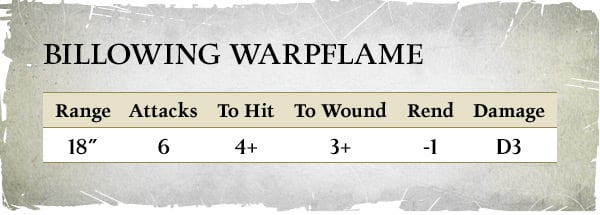 Shooting phase, the first attack phase of the round. After getting yourself into position any of your units with Missile Weapons that didn't Run or Retreat that round can fire away at enemy units in range. Attacking at range and melee is at its core the same practice just how far away you are. Let's use the Billowing Warpflame on the Exalted Flamer of Tzeentch so we have an example in front of us