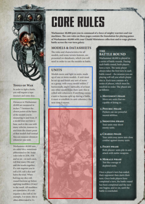 The last thing to cover is how I'd go about fixing this page: The section I highlighted in red is being totally wasted while important information is being scribbled in small writing in the margins. Why does a rule set need "small print"? The rules on this page are often forgotten or overlooked and in my opinion that is mostly due to the layout of this page and the lack of importance it assigns to its contents. Measurement and Coherency are fundamental concepts in 40k, and deserve better.
