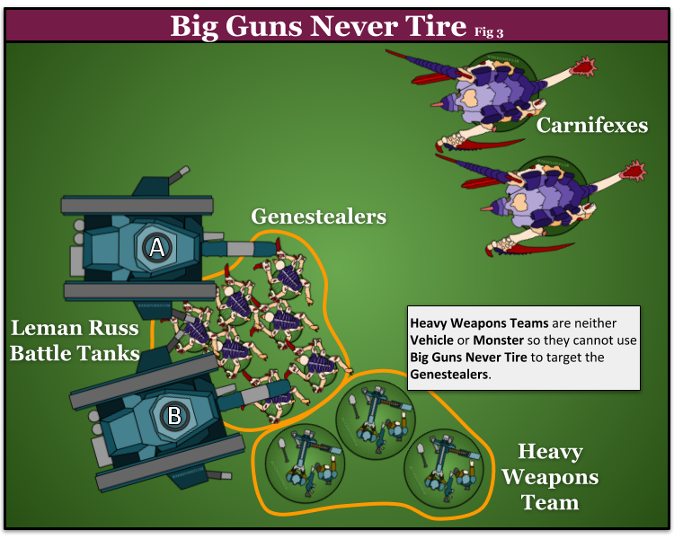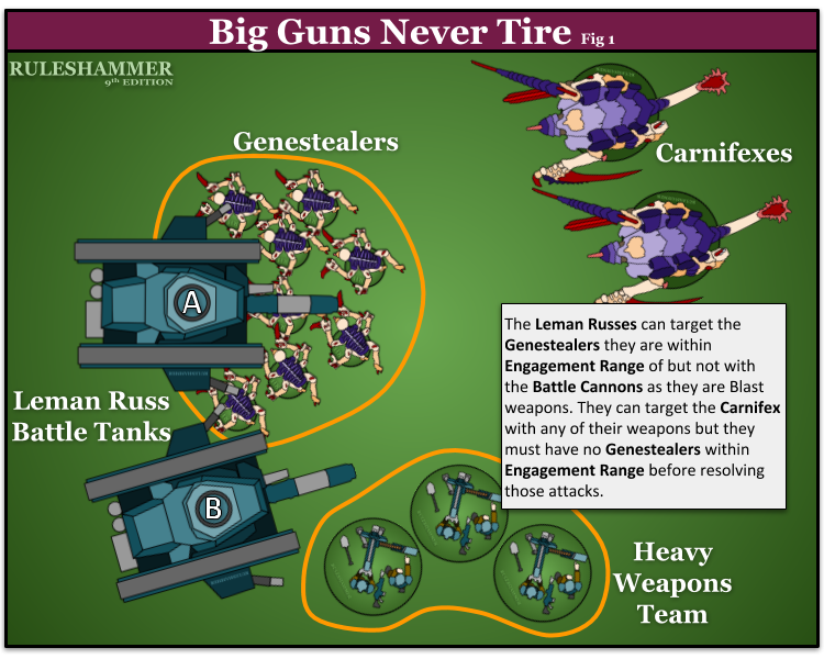 In this scenario a unit of seven Genestealers charged and fought some Leman Russ Battle Tanks (A and B) in the previous turn. It is now the Astra Militarum player’s shooting phase; Big Guns Never Tire allows Leman Russ B to target the Genestealers it is within Engagement Range of, even those they are in combat with a friendly unit. Let’s say it is armed with three Heavy Flamers and a Battlecannon. It targets the Flamers at the Genestealers, but because the Battlecannon is a Blast weapon it can’t so it declares one of the Carnifexes as it’s target