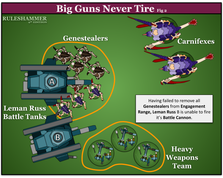If it does remain the same though then the enemy player can remove the five highlight Genstealers and remain within Engagement Range of both Leman Russes. This would prevent Leman Russ B from resolving its Battlecannon Attacks against the Carnifex. Leman Russ A could then go in to kill the remaining 3 Genestealers with it’s not Blast weapons.