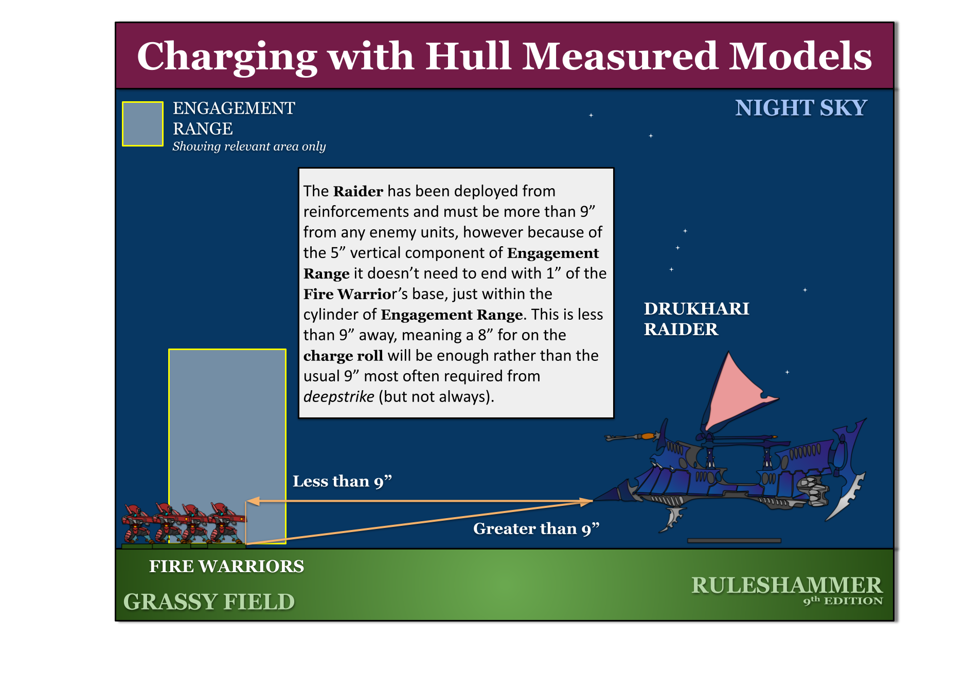 This particular batch of weirdness has been making the rounds lately, especially in Drukhari circles. Due to how Engagement Range in 9th edition is measured, you are within Engagement Range if you are within 1" horizontally and 5" vertically of an enemy unit (creating essentially a 5" tall cylinder for models to enter) - and therefore larger models that measure distances to their hulls and are suspended from the surface of the table can often end up needing shorter charges. It's almost the reverse of the issue where charging up a ruin is easier that I covered here.