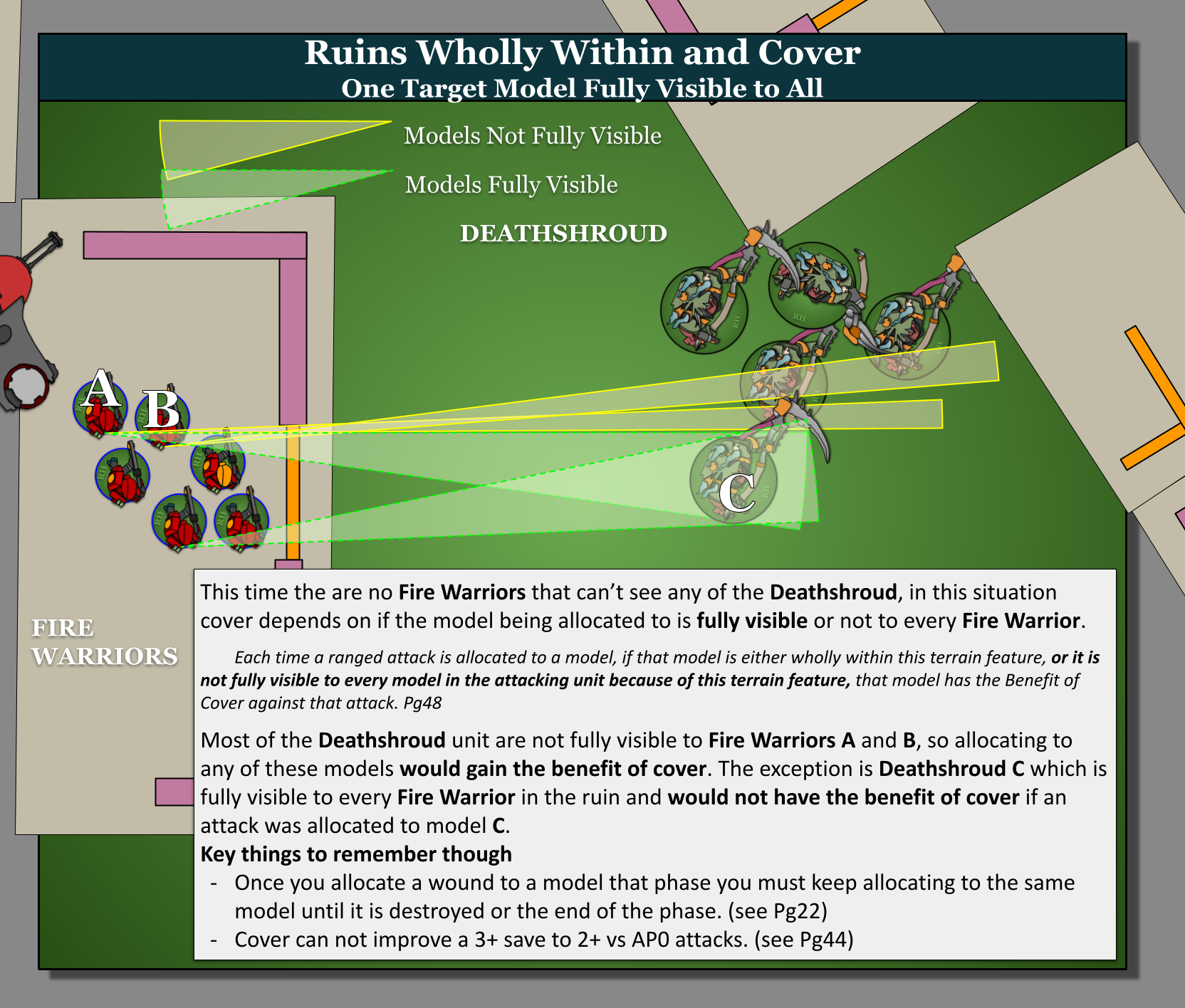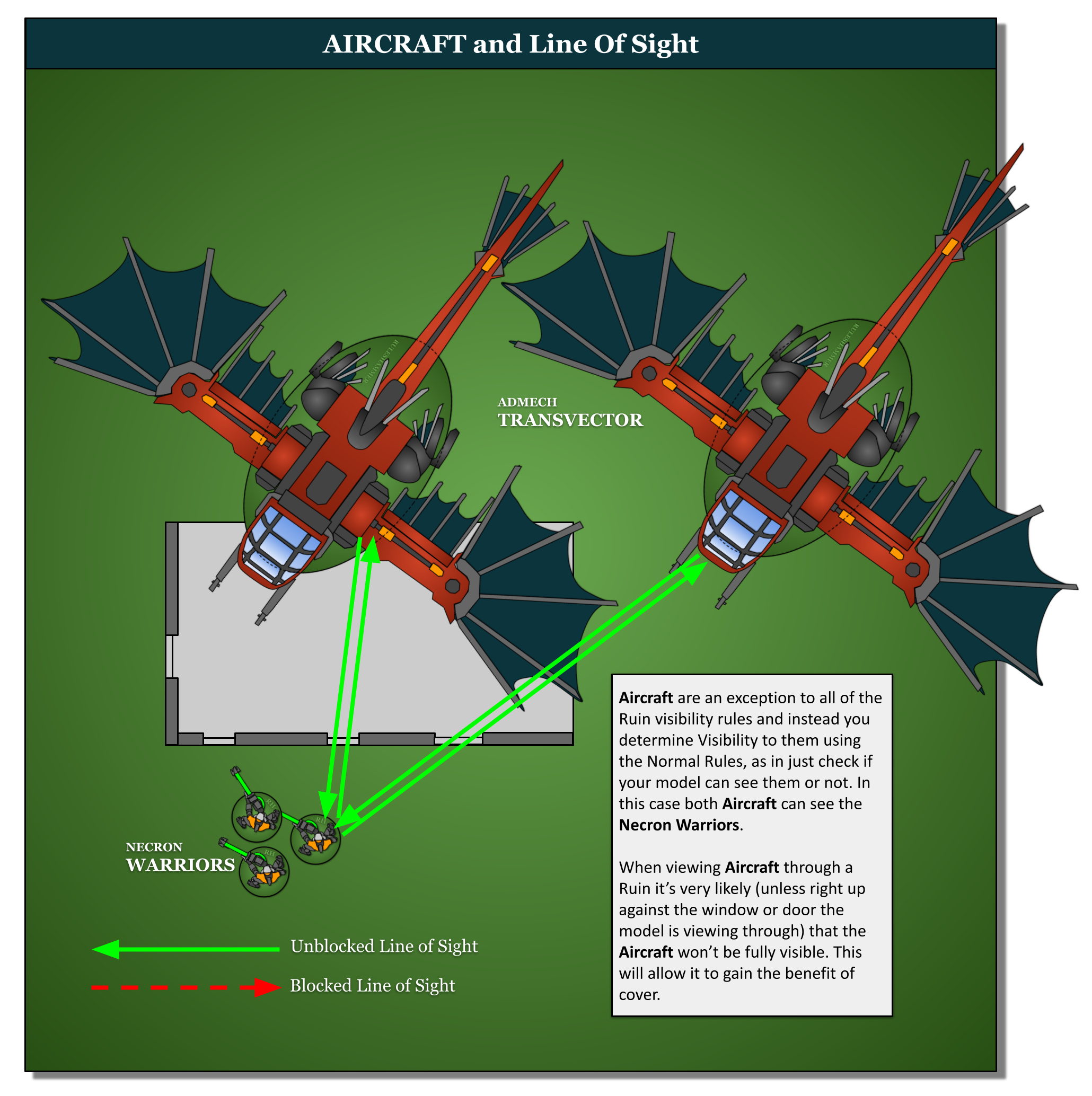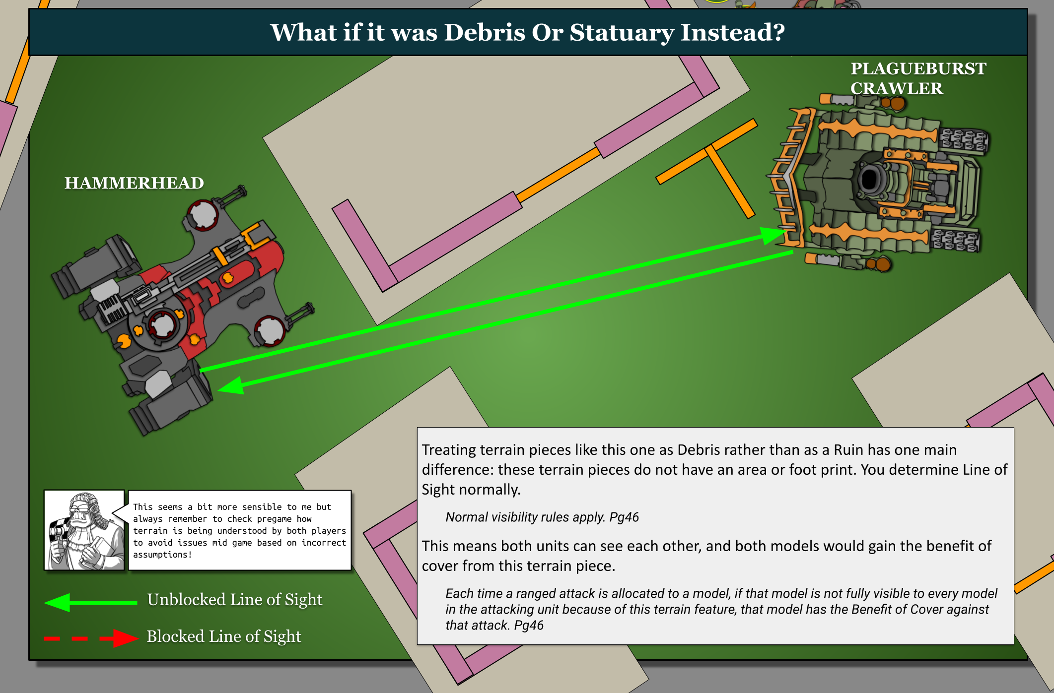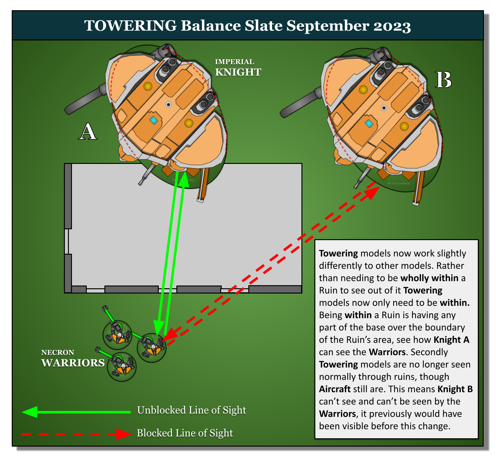 Similar to the OIbscuring rule from older editions but with some new twists, Ruins block Line of Sight under certain circumstances, as demonstrated below.