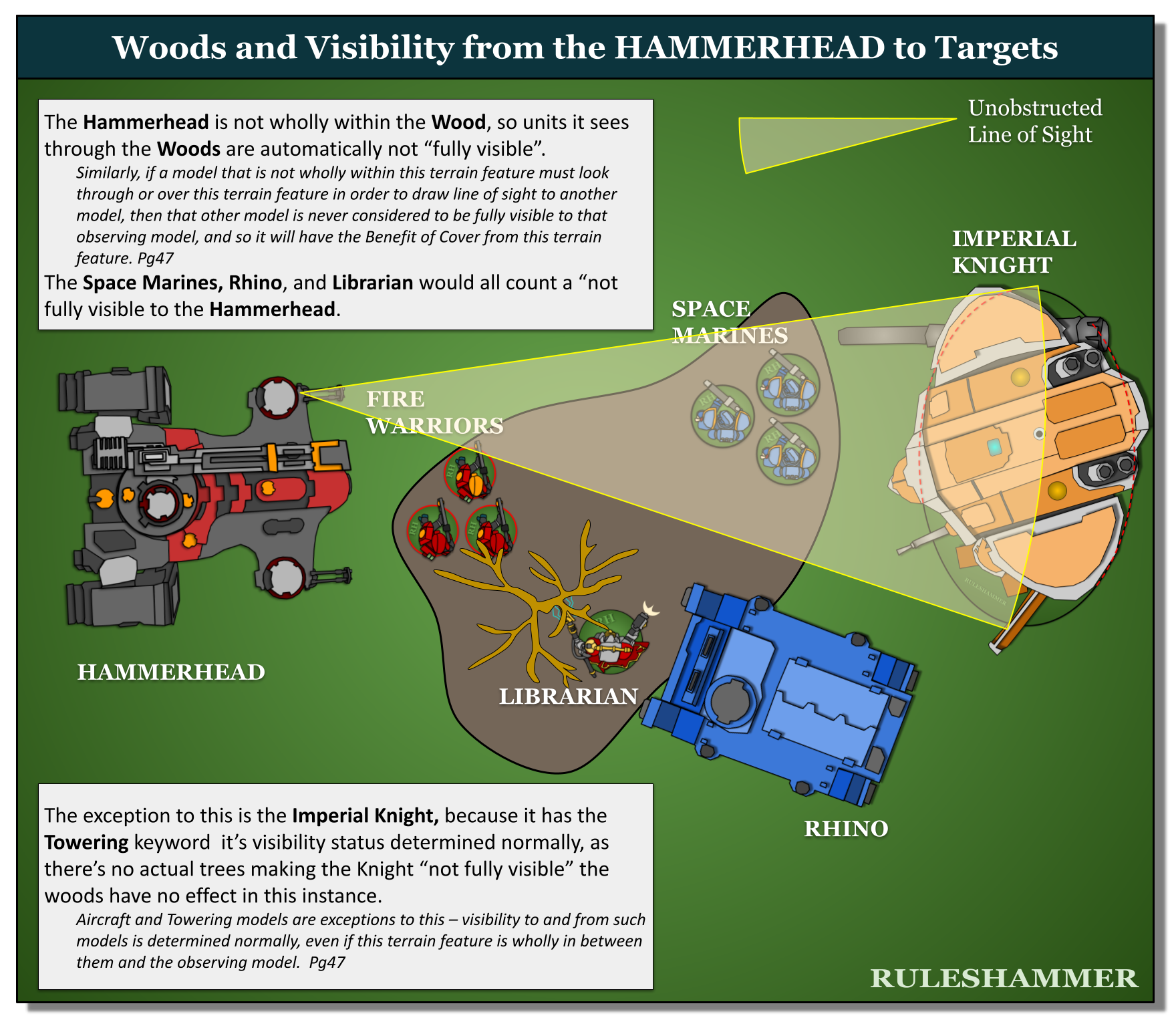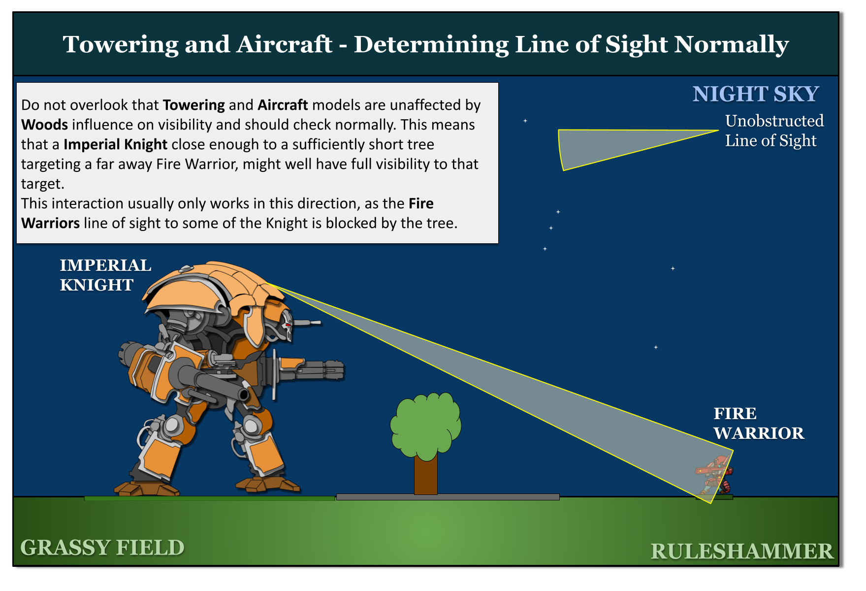 Aircraft and Towering models determine line of sight "normally", this means that due to their height there will be times when they can see over a wood to a fully visible target. Due to changes introduced in the September 2023 Balance Dataslate this is not true for Towering models and Ruins, they can't see through ruins they are not within regardless of height. Aircraft however kept their exception to the Ruins rule and can see over them.
