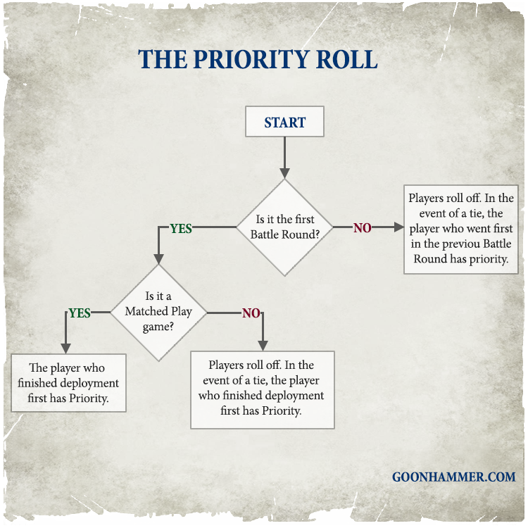 Much like in 2nd edition, both players must roll off to determine who has priority. In Matched Play, the person who finishes deployment first has Priority in the first round without needing to roll off. In all other situations, a roll off is made, with tiebreaker being decided by who went first in the previous battle round. It's worth noting here that the Battlepack for matched play contradicts the core rules: Section 4.1 in the core rules specifies that the players roll off and that the player who finished deployment first has the tiebreaker, whereas the special rules section for matched play replaces this priority roll in the first battle round with a simpler system - if you finished deployment first, you have priority.