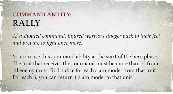 While units are in general going to be smaller in the new edition (due to list construction restricting the number of reinforced units an army can take), the lifespan of these units can really be extended through clever use of retreats and the Rally command. Let’s say you have a unit of 9 Clanrats remaining out of 40 at the bottom of turn 2, and you lose the priority roll and are given second turn. Provided the unit isn’t destroyed you could rally twice and gain back on average 17% of any slain models each time you issue the command.“When a rule refers to one of your phases (for example, your hero phase), it means that phase in your turn. When a rule refers to the or a phase (for example, the hero phase or a hero phase), it means that phase in either player’s turn.” - Footnote in 4.0
