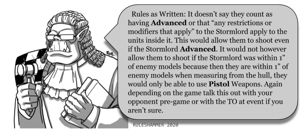 Reader beware, past this point there is a bit of a mess. Readers expecting consistency and logic, be forewarned; you shall not find much of it here.Stormlord - Imperial Guard Extended Firing Deck: Up to 20 models being transported by a Stormlord can shoot in their Shooting phase, measuring and drawing line of sight from any point on the vehicle. Units that shoot in this manner count as having moved if they or the Stormlord moved in the preceding Movement phase.So... this is... yeah...