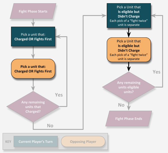 This chart doesn’t cover what makes a unit eligible to fight, just in what order eligible units should. That will be true for all the flowcharts coming up as well! The basic premise is that the units you can choose from in the Fight Phase are split into two loops (for now). “Units that Charged” and “Units that Didn’t”. This article is not about these fight phases though...