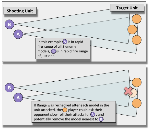 Rapid Fire Weapons - Most players don't even think about it but if you needed to recheck range each time a model was removed you would need to slow roll for almost every rapid fire weapon in the game.