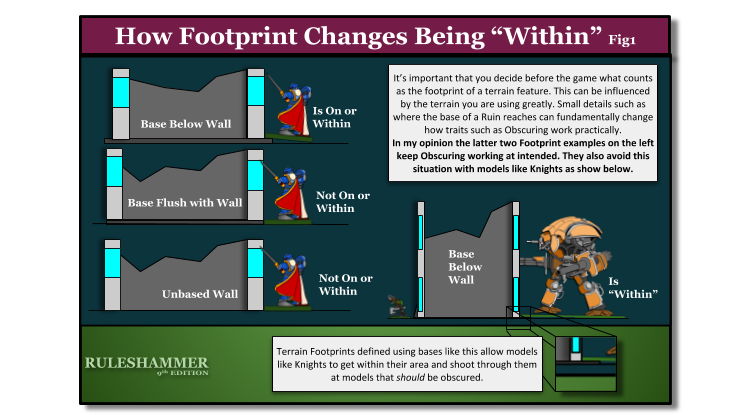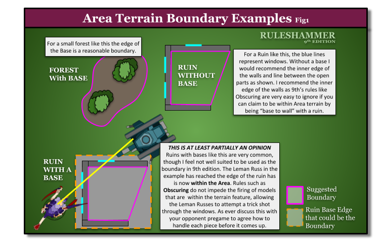 What counts as being "within" area terrain, specifically how you adjudicate a model that is touching the outside wall of a ruin that is an area terrain piece, has been a subject of much discussion and debate for a long time. There is, frustratingly, no 100% answer to this as defined by the rules, but the interpretation I use and think leads to the most sensible interactions with terrain uses footprints as I have demonstrated above, and models count as within them only if part of their base overlaps that boundary by a measurable degree. This can either be because they are inside an area defined by a wall or have moved part of their base onto the base of a terrain piece where the entire base has been agreed to be the footprint.