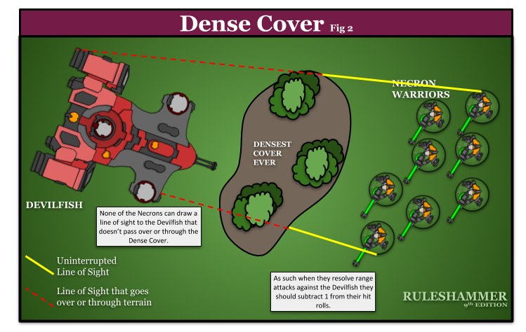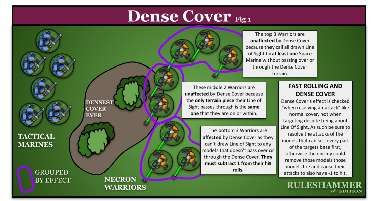 Disclaimer: Dense cover is probably one of rules that is in most need of a rewrite in my opinion. Below are several diagrams and explanations for Dense Cover however they are based on interpreting the Designer Commentary Note from the Core FAQ in a particular way. GW didn't actually amend the wording of Dense Cover to work in the way that this FAQ note suggests.