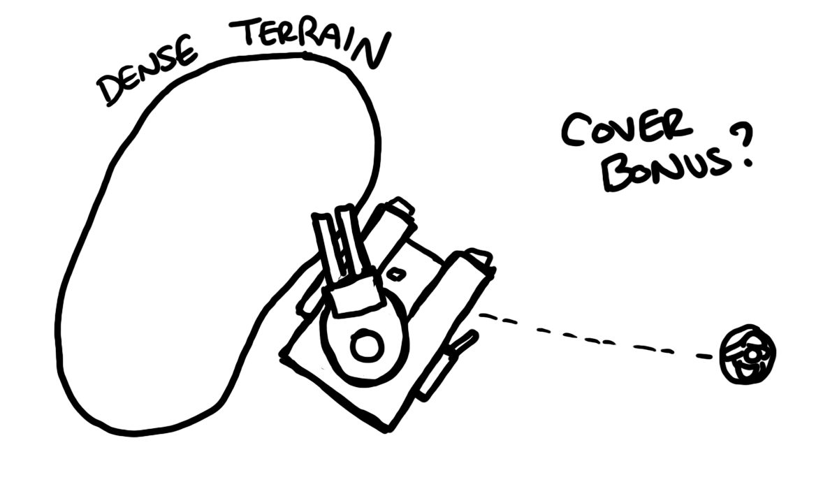 I read this as suggesting that the Dense Terrain piece needs to be between the firing model and the target. In the same way that an Obscuring Terrain pieces needs to be between the firing model and the target to obscure a model. However as GW have not amended Dense as mentioned the explanations below are really only a suggestion. Discuss how Dense will function pregame to avoid confusion.So what does Dense cover do? Well the scenario it’s mostly designed to create is like this.