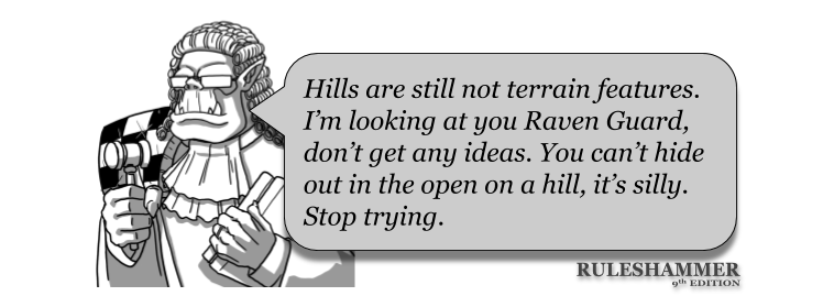 An important consequence of Hills not counting as a terrain features is that abilities such as the Raven Guard chapter tactic that requires the unit to be on a terrain feature would not be triggered by being on a hill, as they are not considered to be terrain pieces even if they are free standing rather than sculpted into the board.