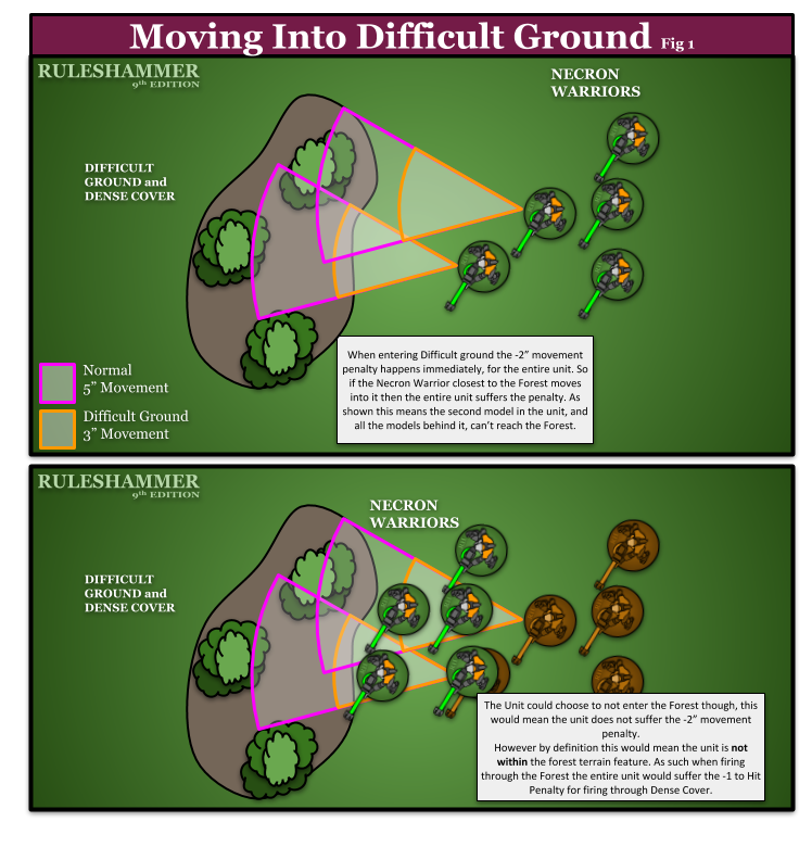 Things of note about this trait is that there are 3 types of move that this trait doesn't reduce: Heroic Interventions, Pile In and Consolidation. All of these are still 3" (or more if your unit has an ability to extend them). One other facet to mention is when measure distances to enter these terrain pieces, remember the subtraction still applies as soon as you move in, you don't need to be attempting to move through.