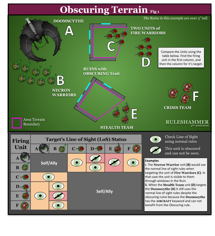 OBSCURING AND DENSE COVER Obscuring and Dense Cover are two terrain traits introduced with ninth edition that interact with visibility. These rules do not overwrite the normal rules for determining visibility, though - they are in addition to them. Specifically, even though the Obscuring rules state that Aircraft and models with a Wounds characteristic of 18+ can be seen through Obscuring terrain, they are still only visible (and hence eligible) targets if the firing model can physically see them (so if the terrain in question is solid and opaque, they are still not eligible targets). Also, in the same way that Obscuring terrain ‘blocks’ visibility when it is in between the firing model and its intended target, Dense Cover terrain imposes a hit penalty whenever it is between the firing model and its intended target (with the noted exceptions). It is not required for a unit to be fulfilling the criteria of ‘gaining the benefits of cover’, as described for Obstacles and Area Terrain, for this penalty to hit rolls to apply (but also note that any rule that ignores the benefits of cover, or that ignores the benefits of cover that impose a penalty on hit rolls, would still ignore that penalty).