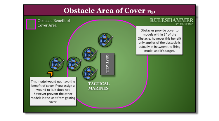 An INFANTRY, BEAST or SWARM model receives the benefits of cover from an Obstacle while it is within 3" of that terrain feature unless, when you resolve an attack that target’s a models unit, you can draw straight lines, 1mm in thickness, to every part of a models base from a single point on the attacking model’s base (or hull) without any of those lines passing over or through any part of the terrain feature. [GT2020 Pg82]