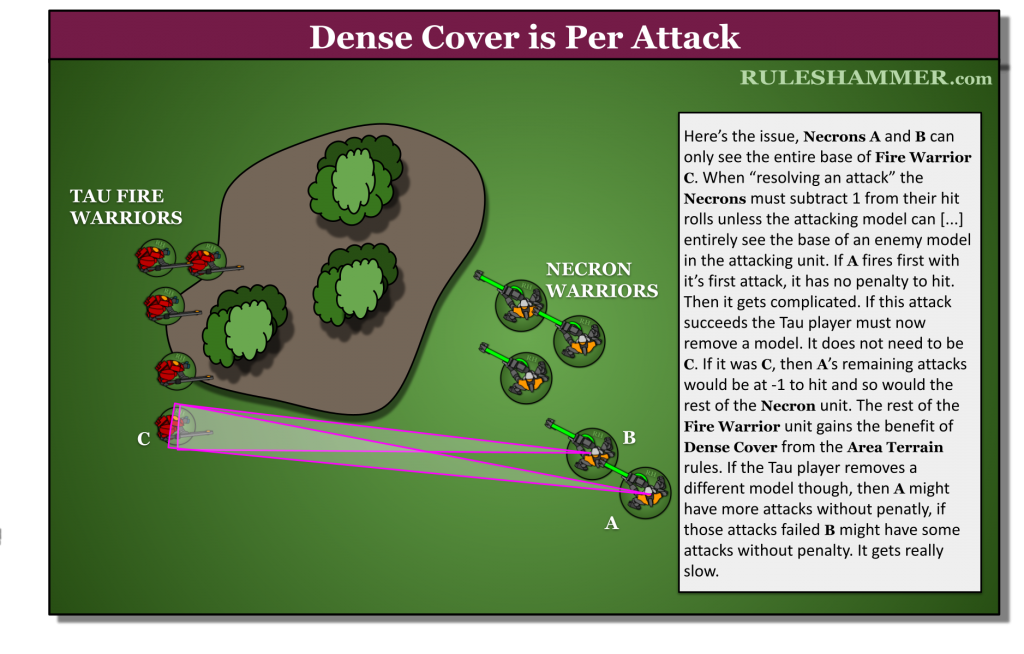 Rules-wise, Dense Cover is weird. I think most players are fully aware of that. The second thing of note is that it’s also a slow rolling nightmare some of the time. The reason for this is because the benefits of Dense Cover are a “per attack” check.If this terrain feature is at least 3″ in height, then subtract 1 from the hit roll when resolving an attack with a ranged weapon unless you can draw straight lines, 1mm in thickness, to every part of at least one model’s base [or hull] in the target unit from a single point on the attacking model’s base [or hull] without any of those lines passing over or through any part of any terrain feature with this trait.