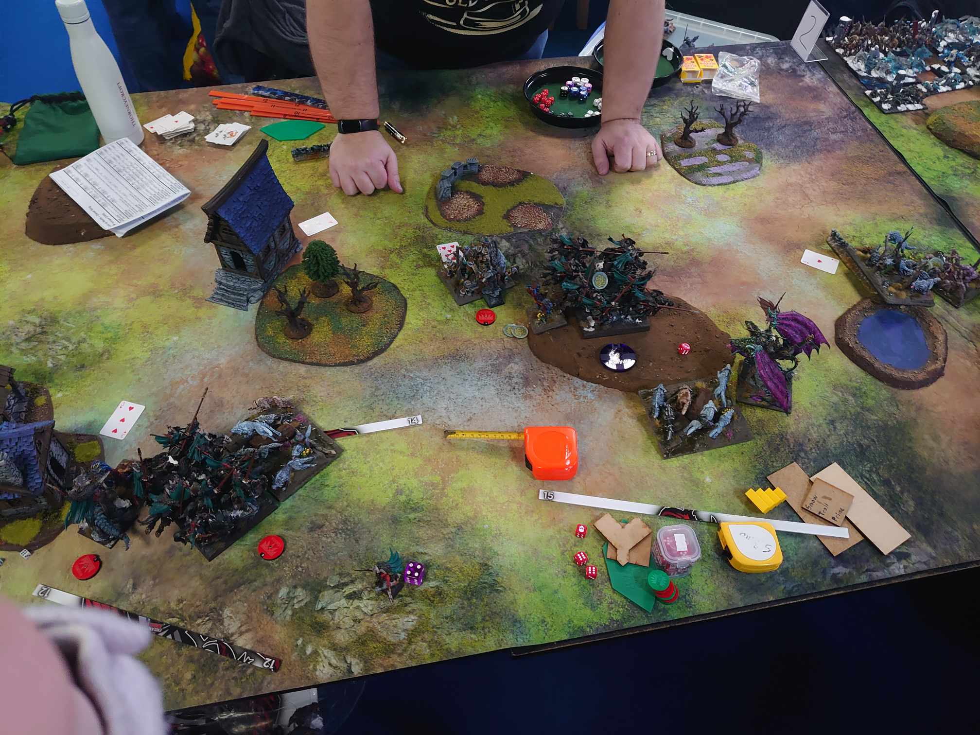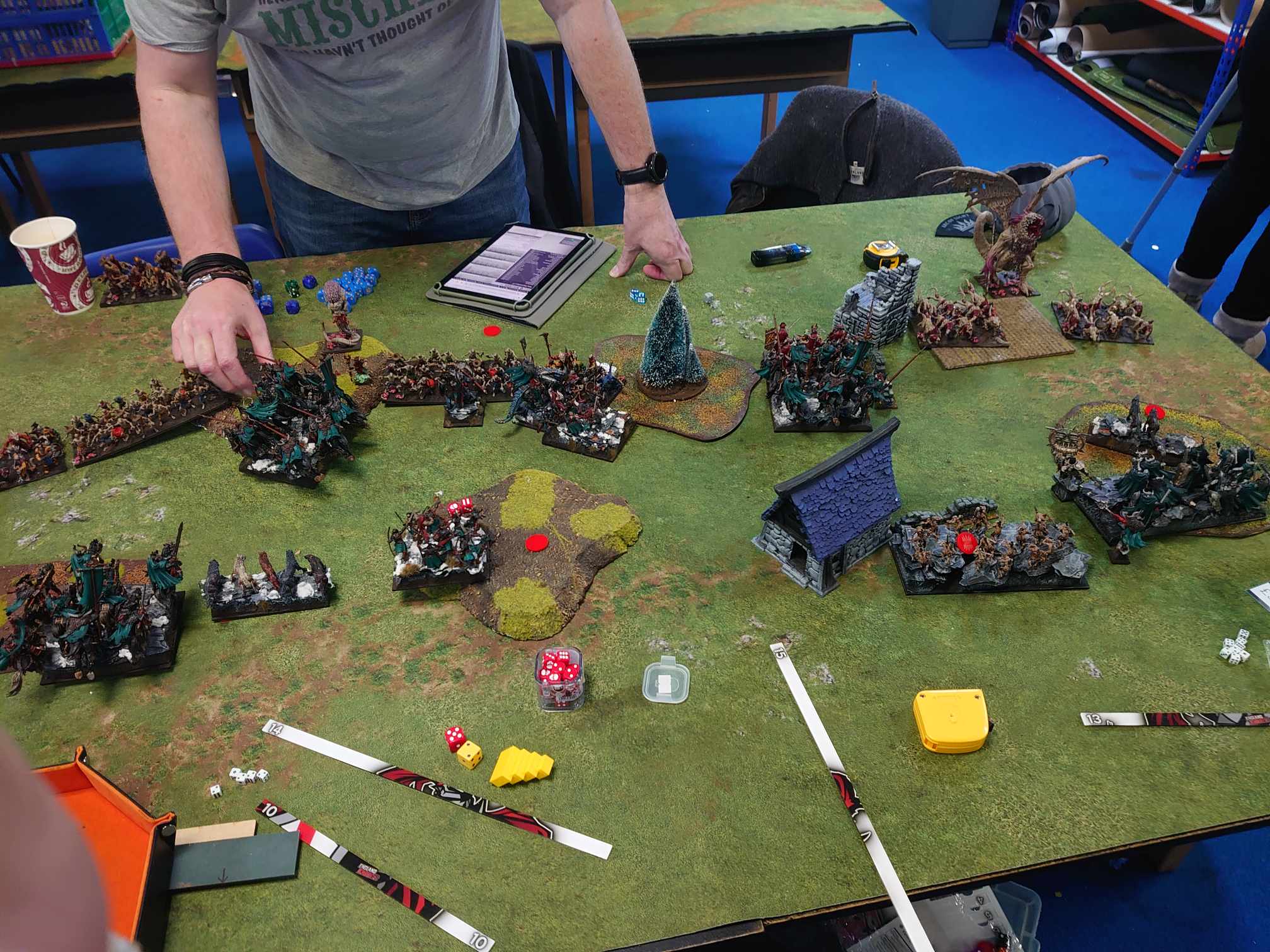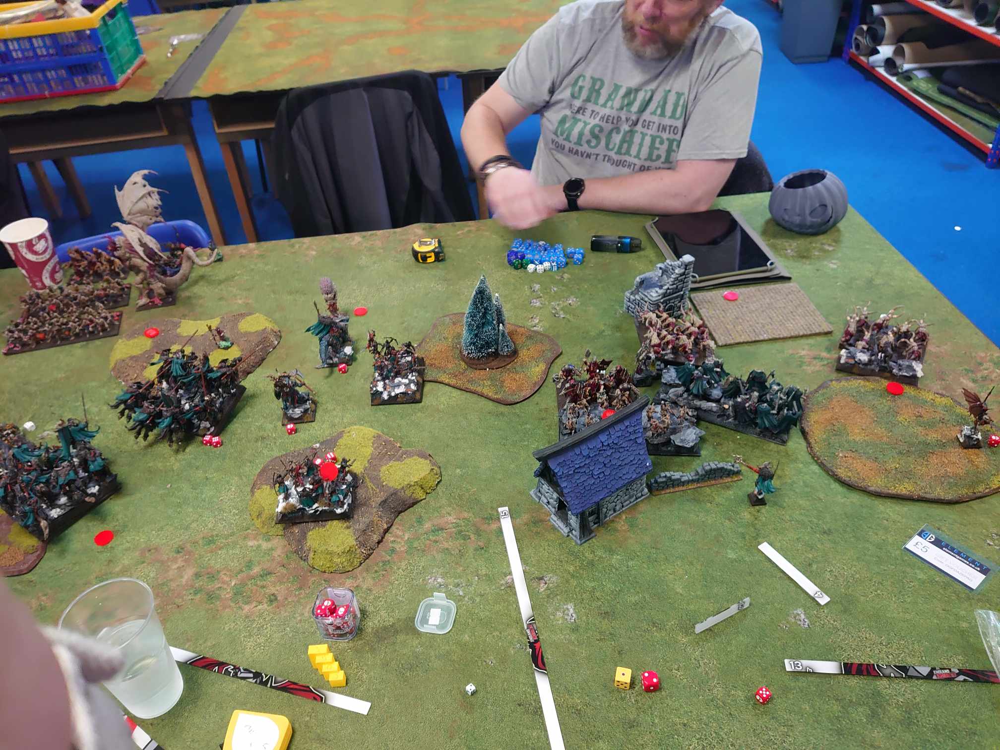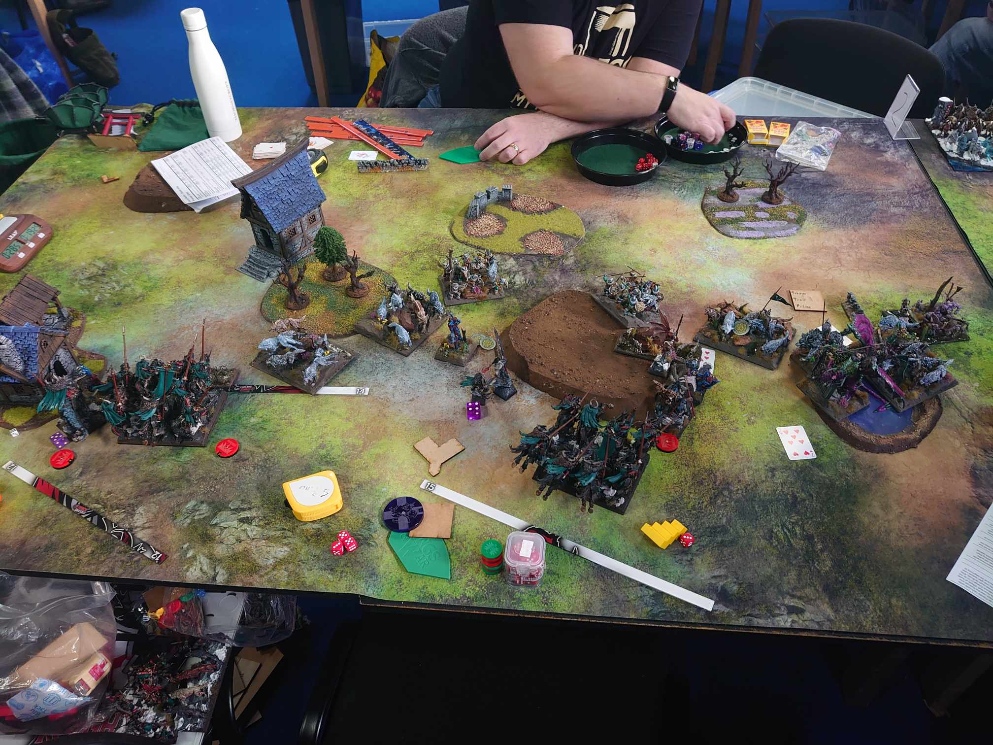 From this point, Aythlan couldn’t really recover, and it was pretty cathartic to channel the week’s frustrations into an absolute tabling (despite him being a lovely guy). Literally everything bar the Horror died in a wave of violence lasting just a couple of turns, and because of the sudden collapse he didn’t have time to burn any Loot counters - so, I ended the day with a really high-scoring win (I think I might actually have maxed out). Aythlan was a good sport about it and had an absolutely lovely army, and explained that his Shadowhound plan was to do an end-run around the terrain to threaten my flank - sadly their deployment was just slightly too early to stop me seeing it coming. With this game over, I very quickly made ready to return home, as I knew Ben hadn’t taken a single painkiller and wanted to rectify that immediately.