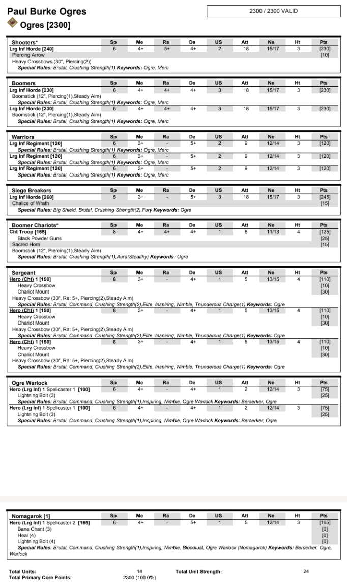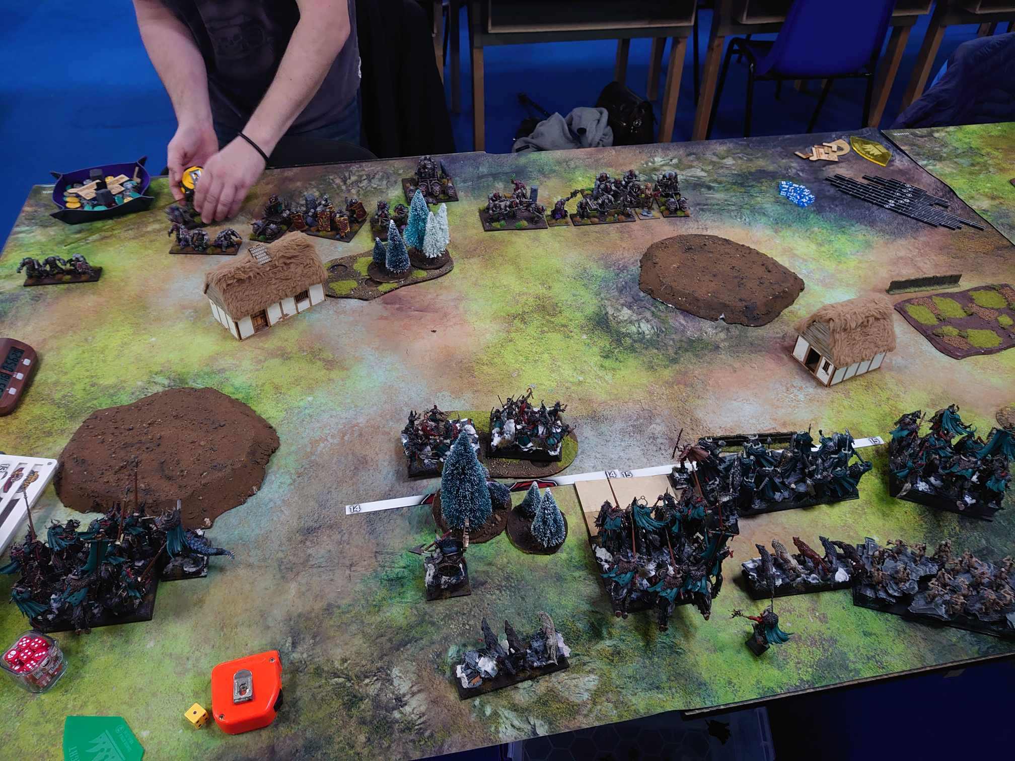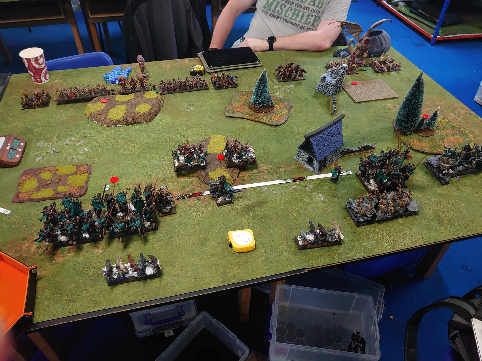 A fact of life at northern events here is that losing round one is often no protection from a very strong second round opponent. Paul is one of the top players in the country, and is playing a faction that was the bane of my life during Clash of Kings 2024. So, it’s time to get revenge.This was the first major UK event using Clash ‘25. As such, it would be the first time we’d see Ogres in their nerfed state, with Siege Breakers no longer the order of the day. Paul had adapted to this with a very, very shooty build, taking advantage of the fact that any given Ogre unit is probably acceptable at worst in melee to soften up opponents on the way in. I really liked his Hero loadout, making innovative use of Ogre Sergeants on Chariots that presented a threat both shooty and punchy, and, while the focus on guns was probably a good thing for me, the bulky US would be difficult to overcome in this scenario.