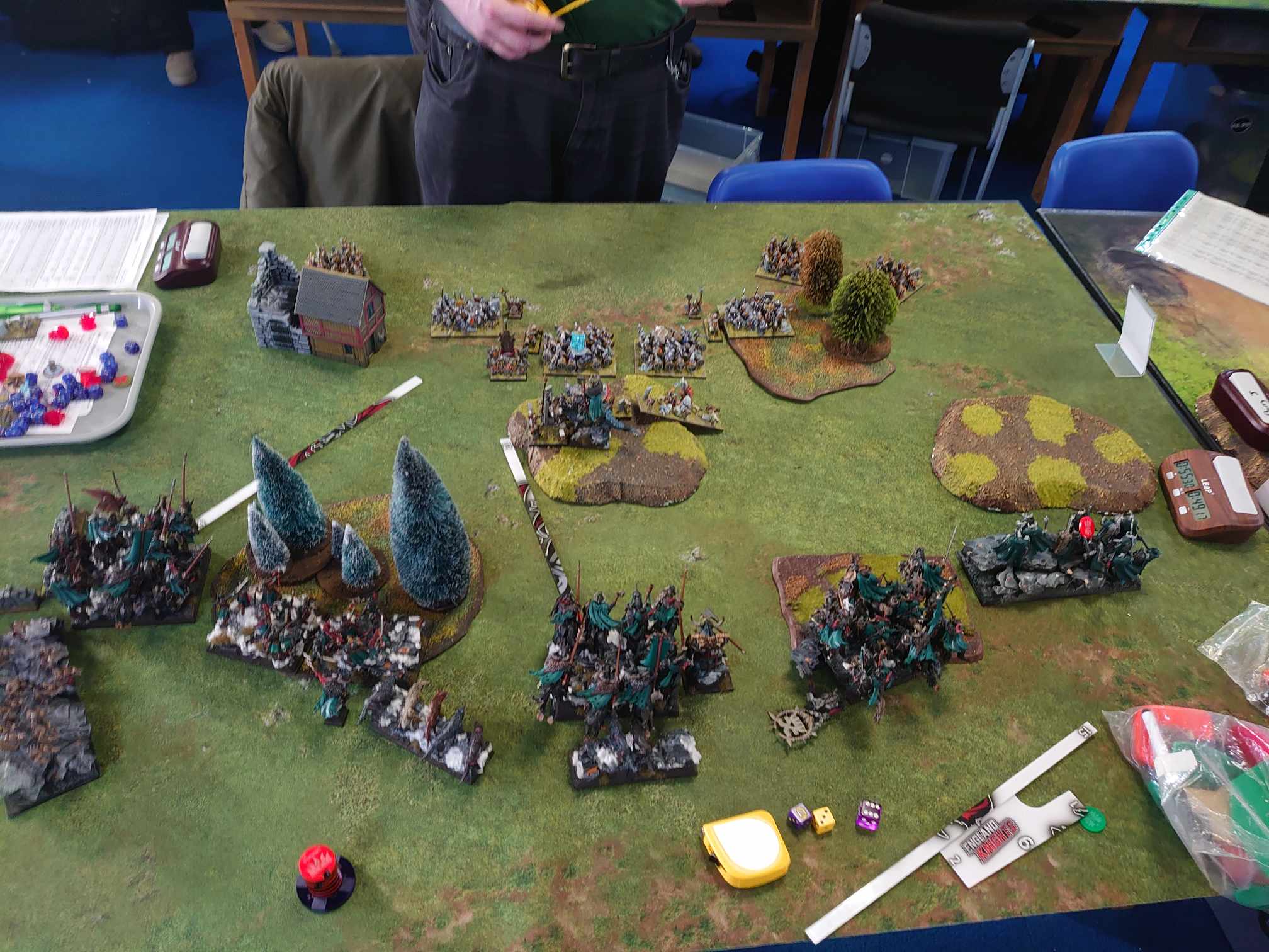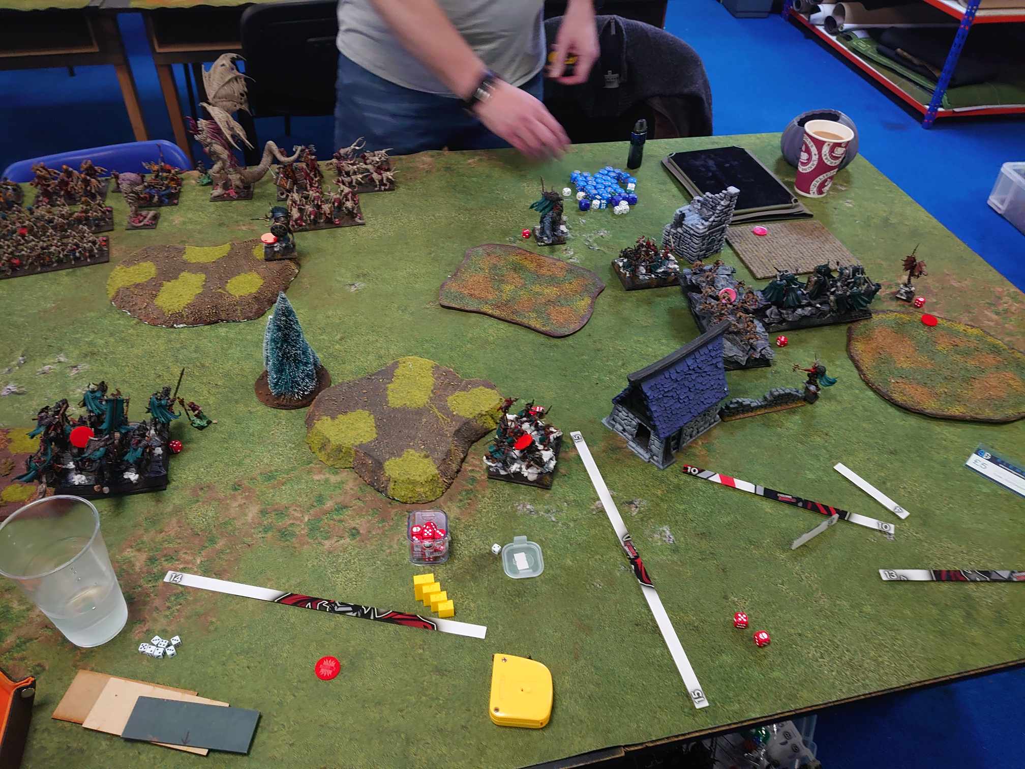 Ed slammed me back in turn, beginning a nasty grind fest in the centre, but didn’t pick up much beyond the Lord on Frostfang (who was never particularly long for this world) and Kruufnir, who I’d sent in to draw out some pieces. This didn’t feel too bad at first, but I was grateful for my backup Lord and Magus, who made sure things were still Inspired. I really wanted to pick up Ed’s Loot counter at this point, but De 6+ is a stat that gets respect for a reason, so I didn’t manage it despite dumping a bunch of damage on the carriers. Meanwhile, my Snow Foxes double charged the last Mastiff Hunting Pack to do a grand total of… one damage. This would be a running theme later. In response, my centre was well and truly collapsed, and a big blow was dealt to my Human Tribesmen with a double-6 Waver, preventing them from taking a very nice flank charge. Not to worry, my Lord will kill these Mastiffs to open up the mid-board again and let the rest of my right flank swing in. And… one damage. Eek! The rest of my Snow Foxes were summarily cleaned up, but one thing did go in my favour - my Night Raiders, who had been sitting pretty in their starting forest, finished shooting off the left hand Shieldbreakers, meaning they could start moving up and getting involved.