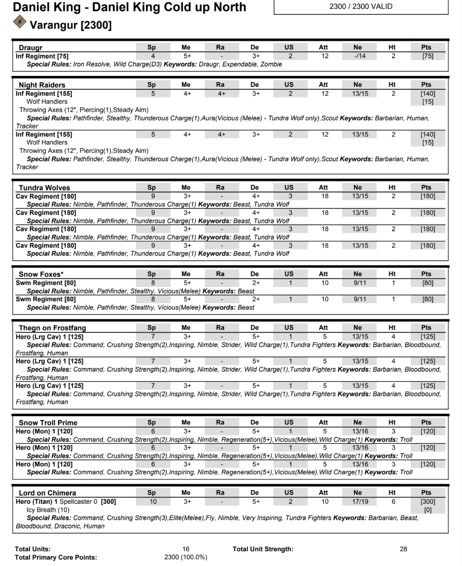 Anyway, let's talk about something I got right. For this one, I’d not made the same mistakes I did at Warfare, and had got my oppo research done well in advance. It told me I was in for the usual stacked player base, and also that the TOs strongly disagreed on the merits of the Hammer of Measured Force. Perhaps they'd read our article. Overall, though,, I knew I’d be facing a shooty field, and brought my standard “don’t shoot me please” Stealthy skew. It was basically the same as the shell at Warfare, but the Lord on Chimera was gone - frankly, I was just sick of using the big idiot, but I also didn’t feel like the rest of the list was supporting it as well as it needed, so I wanted to try some stuff that was a bit slower in order to get more beef. I also fancied trying a Magus for Transfusion and Bane Chant, so in one went along with some trashy Draugr idiots. One last little bit of spice was that there were three - three! - Varangur players in total, and I was determined not to finish dead last among them.
